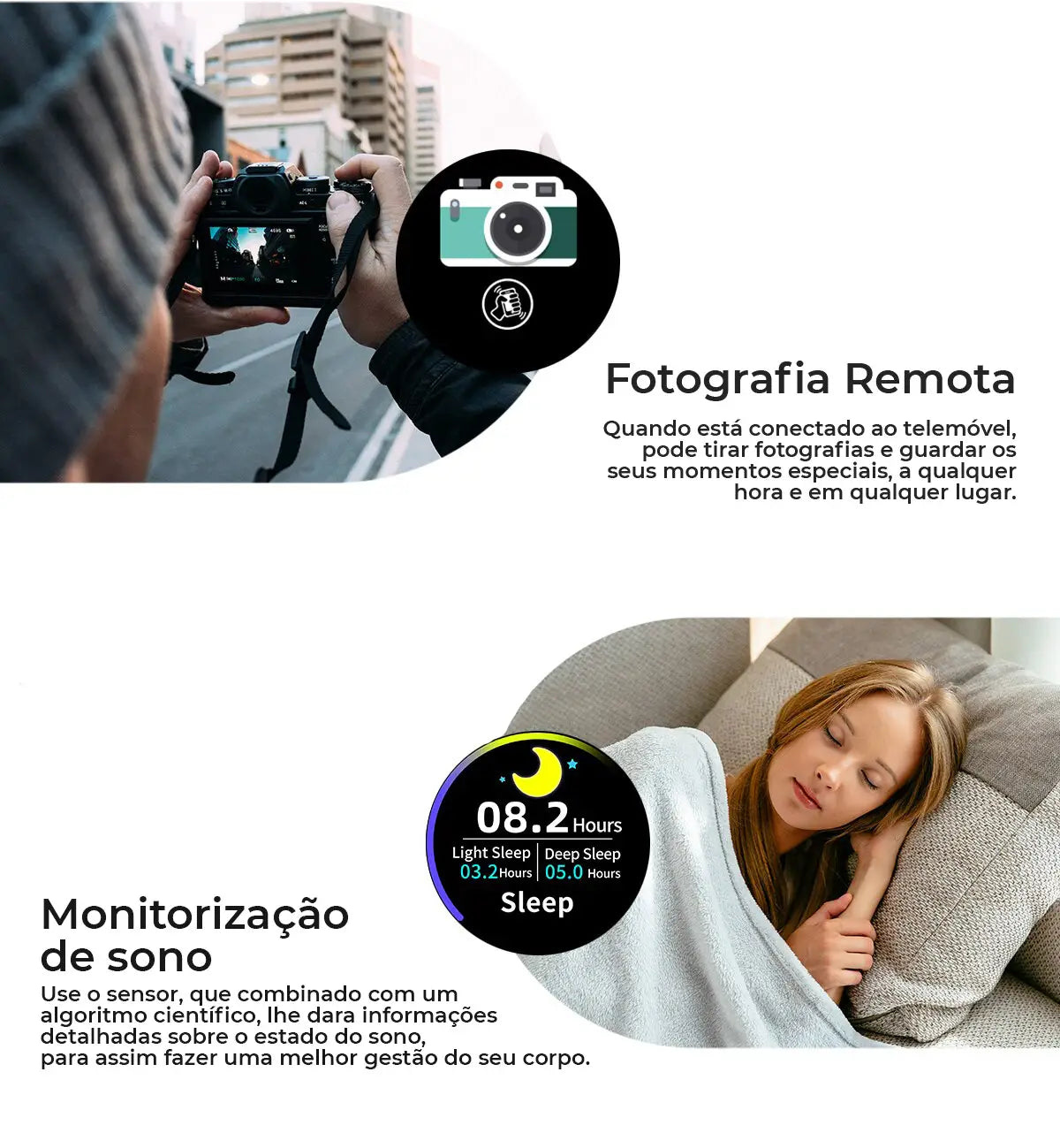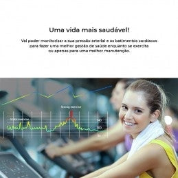 Monitorização da Saúde em Tempo Real – Mede a frequência cardíaca, pressão arterial e saturação de oxigénio no sangue (SpO₂).
