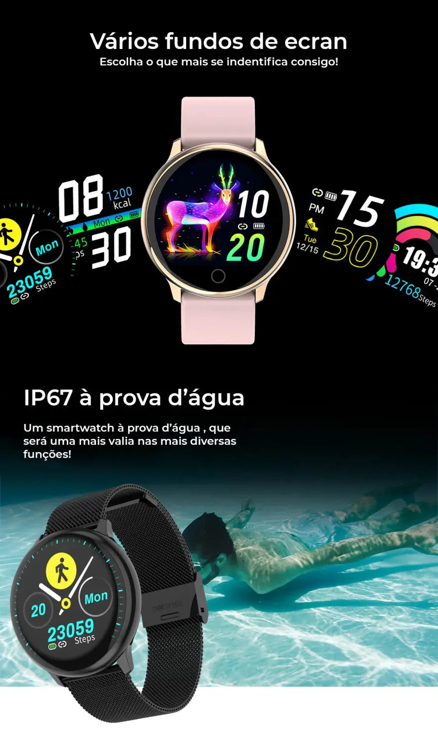 O Smartwatch Q16 oferece uma experiência completa de monitorização de saúde, chamadas e notificações, tornando-se um acessório indispensável para quem quer praticidade no dia a dia. Com classificação IP67 à prova de água, pode usá-lo sem preocupações em qualquer ambiente.