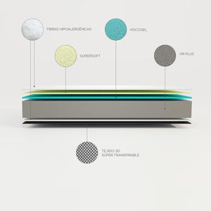 - Viscoelástico 3D reforçado, garantindo um toque suave e respirabilidade constante.