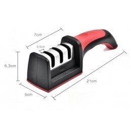 Eis a solução indicada para si, que é muito fácil e prática de manusear, basta segurar o afiador com uma mão e com a outra passar a faca, afiando de forma segura e rápida.