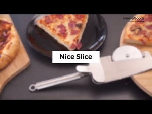 Um original e prático cortador para piza com um design muito inovador e completo, já que dispõe de disco de corte, dentes de serra para as extremidades, pá para servir os pedaços e pinça para segurar.