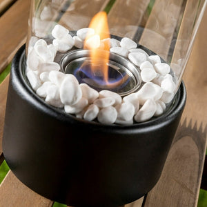 Qualidade e segurança: a sua base circular de ferro é resistente e estável. O abajur protetor de vidro impede que a chama se apague ficando retida no interior. Inclui pedras decorativas, dois pavios de fibra reutilizáveis, acessório queimador (máximo 150 ml), acessório para ligar/desligar a chama com conforto e segurança, e instruções de utilização e montagem.