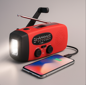 💡 DICA: Mantenha sempre carregada para situações de emergência. A manivela manual garante energia mesmo quando não há eletricidade disponível!