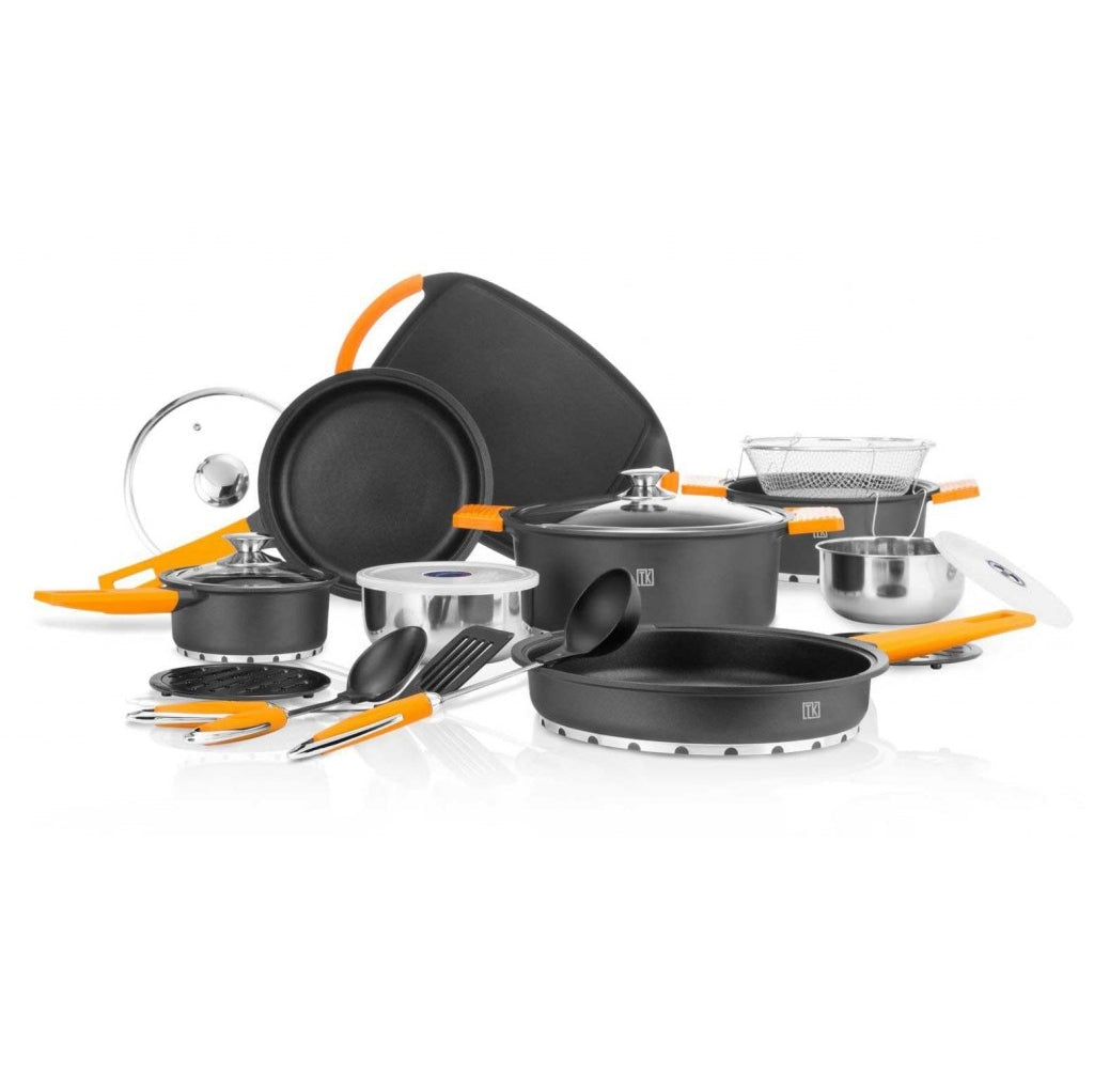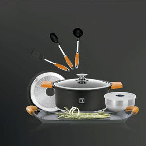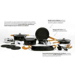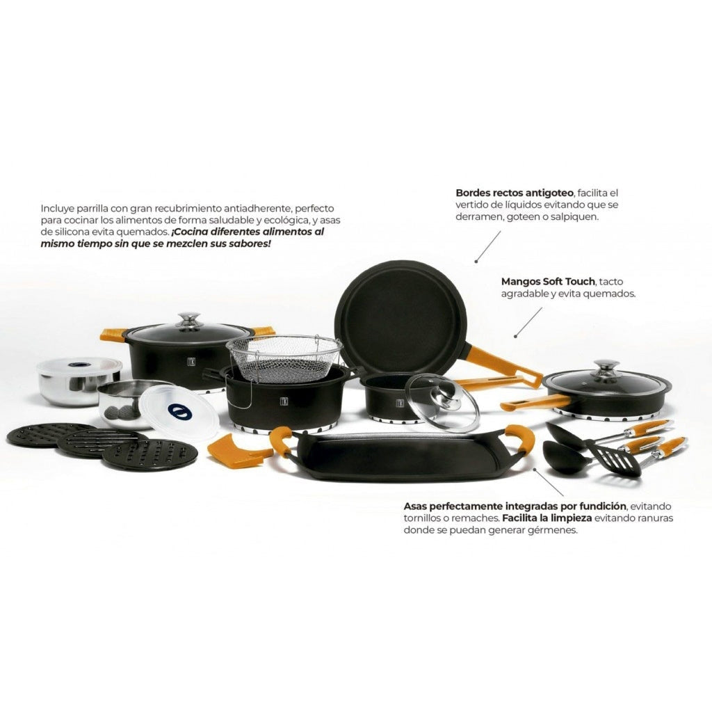 Este conjunto completo de utensílios de cozinha em alumínio fundido, composto por 27 peças, é ideal para quem deseja preparar pratos deliciosos na grelha ou em qualquer outro tipo de fogão. Com um design contemporâneo e elegante em acabamento preto mate, esta bateria de cozinha não só moderniza a sua cozinha como também assegura a qualidade e sucesso na preparação das suas receitas favoritas.